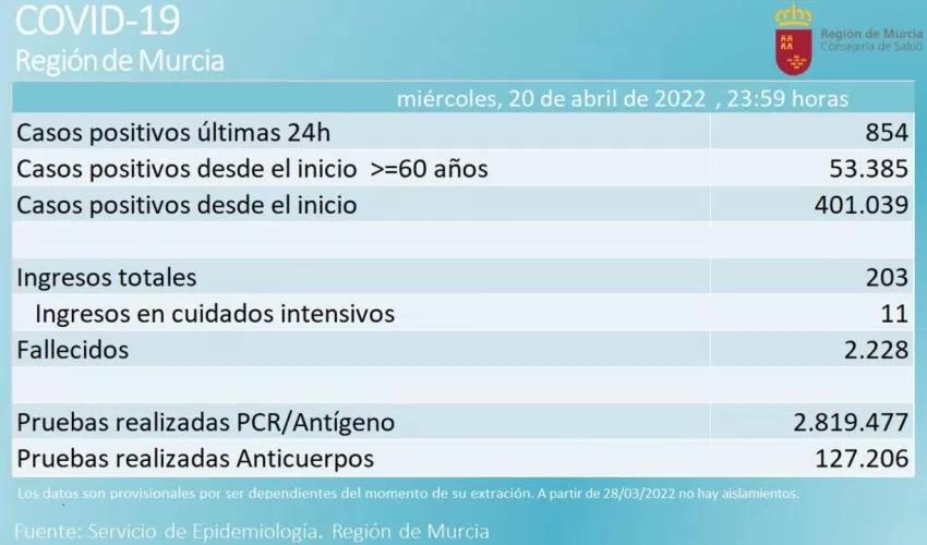 La Región de Murcia ha registrado en las últimas 24 horas un total de 854 casos nuevos de coronavirus, 328 más que en la jornada anterior, y dos fallecidos por esta causa, según se desprende de la página web de la Consejería de Salud.