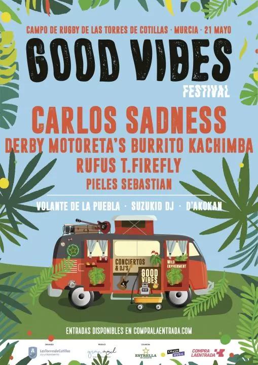 La primera edición del “Good Vibes Festival” tendrá lugar este sábado 21 de mayo (17:00 horas) en el campo municipal de césped natural de Las Torres de Cotillas. Un encuentro abierto para todas las edades que ofrecerá cerca de 6 horas de música y food trucks, y que tendrá como cabeza de cartel al barcelonés Carlos Sadness (23:30 horas).
