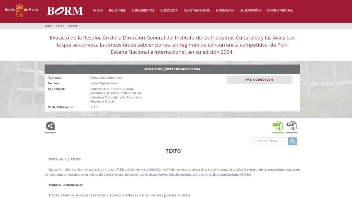 Entre los gastos subvencionables están aquellos relativos al desplazamiento, alojamiento y manutención de los profesionales en los espectáculos que realicen las giras. El plazo de presentación de solicitudes es de 15 días hábiles y comienza mañana, 3 de mayo. Para más información, se puede consultar la convocatoria en el Boletín Oficial de la Región de Murcia y en la sección de ‘Convocatorias’ de la página web del Instituto de las Industrias Culturales y las Artes.