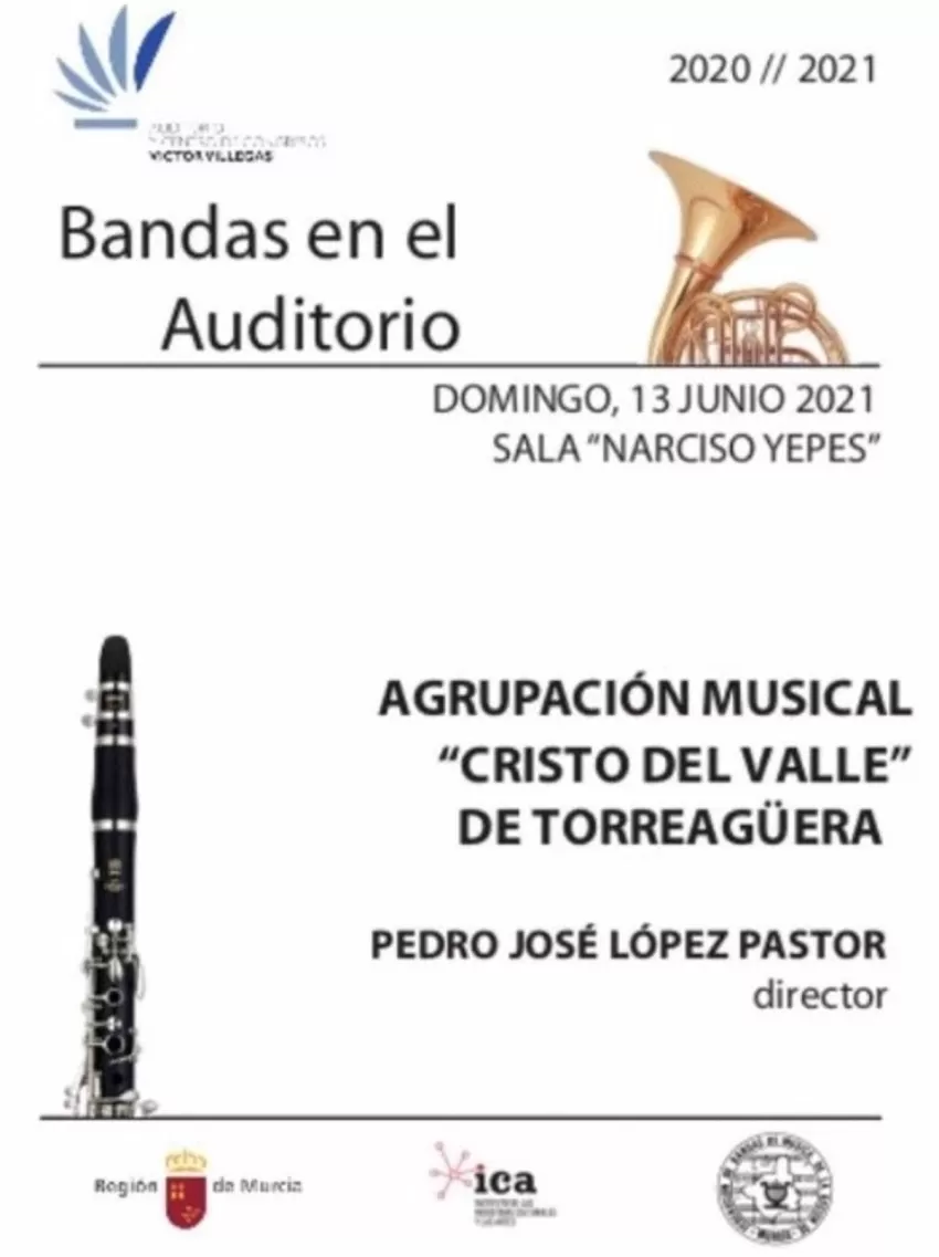 El ciclo 'Bandas en el Auditorio', promovido por la Consejería de Educación y Cultura y la Federación de Bandas de Música de la Región de Murcia en el Auditorio regional Víctor Villegas retoma su actividad suspendida por la pandemia mañana domingo, 13 de junio, con la Agrupación Musical Cristo del Valle de Torreagüera sobre el escenario de la Sala Narciso Yepes.