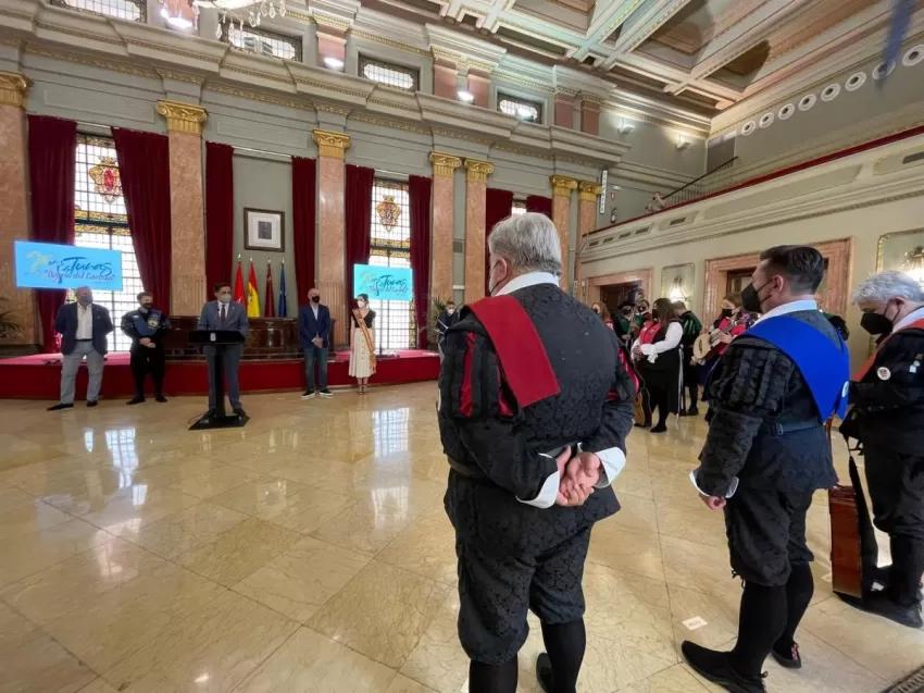 El alcalde de Murcia, José Antonio Serrano, y el concejal de Cultura, Turismo y Deportes, Pedro García Rex, han recibido, junto a otros miembros de la corporación municipal, a una representación de las tunas participantes en la 25ª edición del Certamen Internacional del Barrio del Carmen que congrega, esta vez, a nueve agrupaciones procedentes de Puerto Rico, Colombia, Chile, Portugal y España (Valencia, Orihuela, Murcia y Almería).