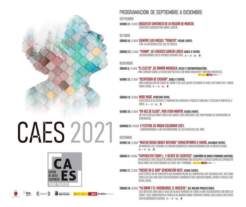 Teatro, música, danza y magia en la nueva programación del Centro de Artes Escénicas (CAES) de Torre Pacheco, dirigida a todos los públicos. Una variada programación en la que por su escenario pasarán artistas de renombre, con espectáculos de todos los géneros y para todos los públicos.