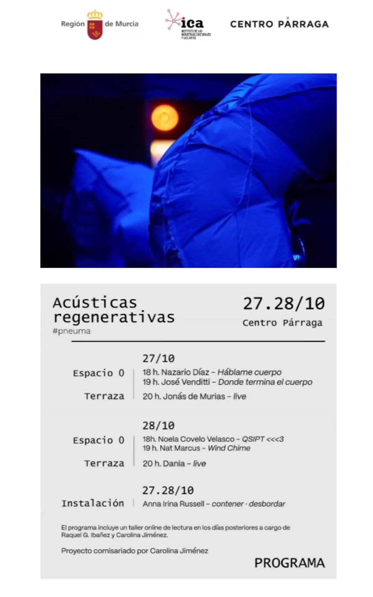La entrada a 'pneuma/Acústicas regenerativas' es gratuita hasta completar aforo y, en el apartado de programación de la página web del Centro Párraga, se puede encontrar más información sobre este nuevo evento cultural, así como el horario de las actuaciones.