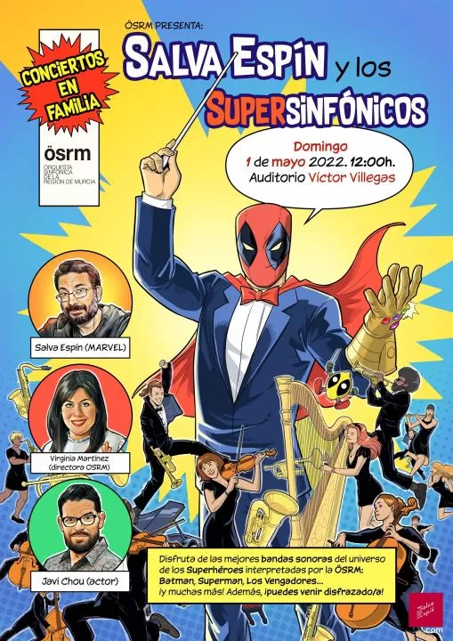 En esta ocasión, las familias disfrutarán de 'Salva Espín y los supersinfónicos', con guion y actuación de Javi Chou y la música más espectacular del universo de los superhéroes, como 'Superman', 'Los vengadores' o 'Spiderman', interpretada por la Orquesta Sinfónica de la Región y dirigida por su titular, Virginia Martínez.