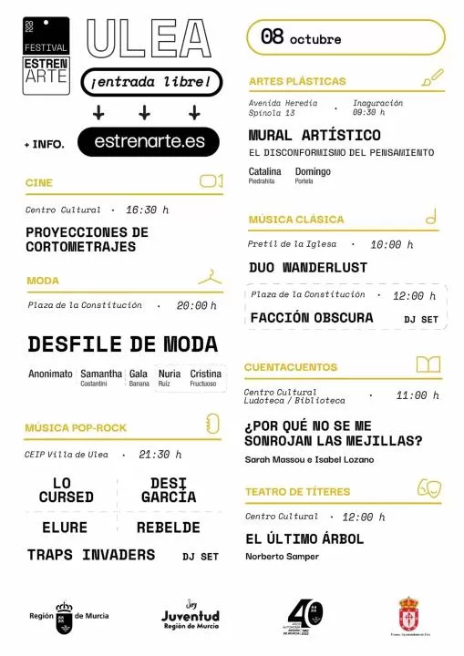 El Festival Estrenarte retoma este sábado su actividad con la segunda jornada de exhibiciones del talento joven de la Región de Murcia, tras la celebrada en Abanilla en septiembre. Ulea ha sido el municipio elegido para acoger diferentes disciplinas artísticas como moda, artes visuales, música, cuentacuentos, cine, teatro y danza, con entrada libre y gratuita a todas las actividades y exhibiciones.