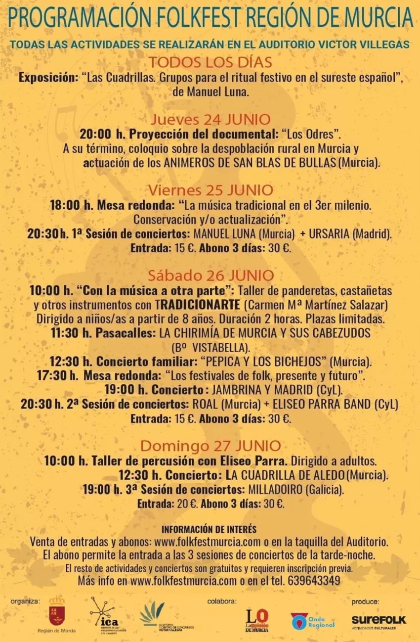 La iniciativa nace con vocación de continuidad y crecimiento y está organizado por la Consejería de Educación y Cultura. El festival continuará el viernes 25 con la mesa redonda 'La música tradicional en el tercer milenio: conservación y/o actualización', moderada por Manolo Muñoz Zielinski y con la participación de Juan García Serrano, de la Peña huertana La Crilla, Manuel Sánchez Martínez, de Foro de las Cuadrillas, y Juan José Robles, músico de folk. El plato fuerte del día será el concierto de Manuel Luna y Ursaria, a las 20:30 horas.