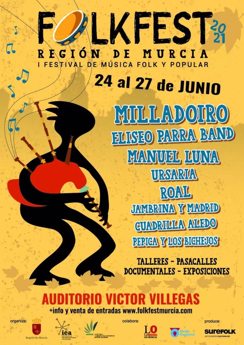 El cartel del festival se mantiene y contará con tres agrupaciones tradicionales de la Región como son los Animeros de San Blas de Bullas, la Cuadrilla de Aledo y La Chirimía de Murcia; las bandas de Manuel Luna y ROAL; y un espectáculo de público familiar a cargo de Pepica y los Bichejos. En cuanto a la presencia nacional, estará formada por Milladoiro, Ursaria, Jambrina y Madrid y Eliseo Parra Banda.