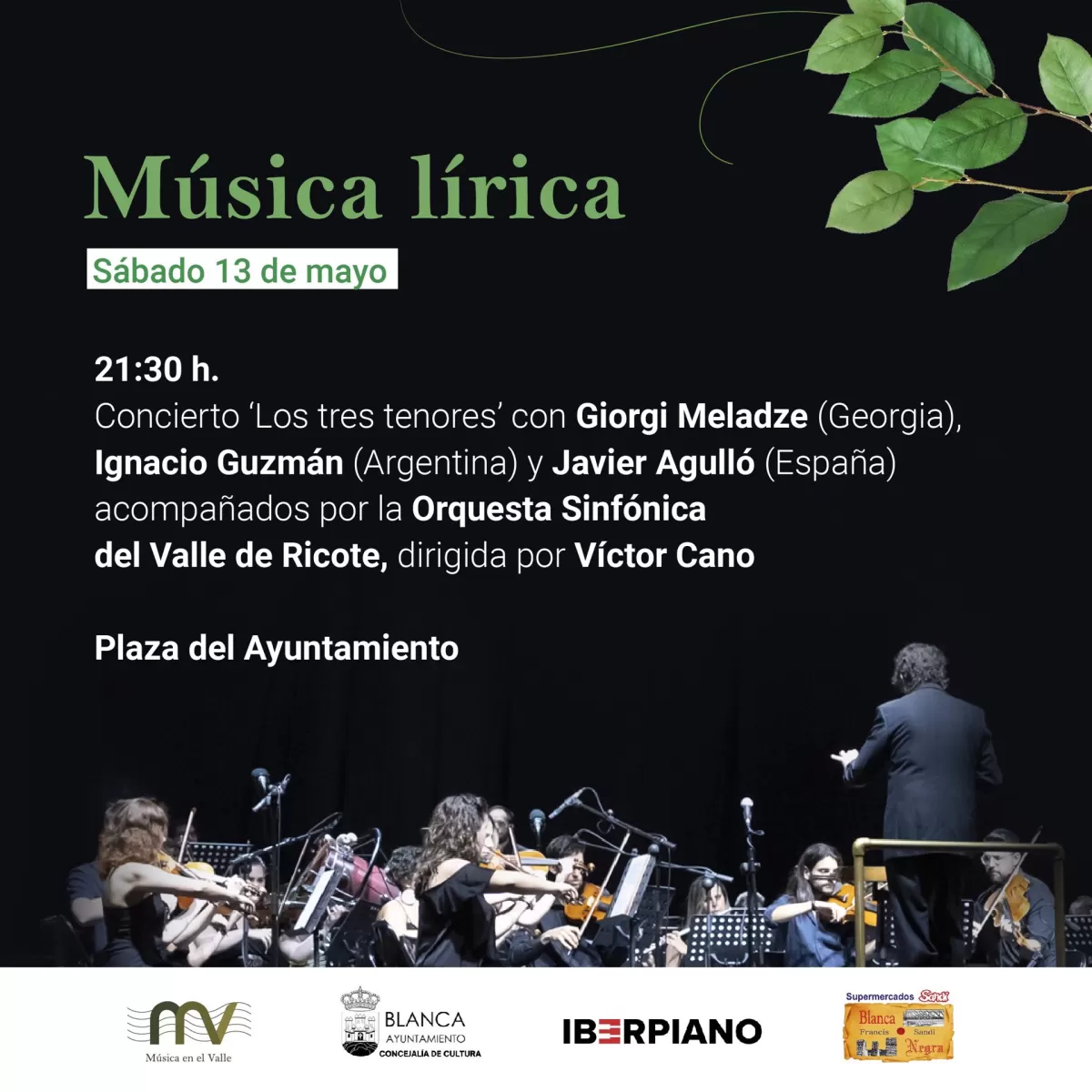 El II Festival Música en el Valle levanta el telón este sábado, a las 21.30 horas, en la plaza del Ayuntamiento de Blanca, con el concierto de 'Los tres tenores', que estarán acompañados por la Orquesta Sinfónica del Valle de Ricote bajo la dirección musical de Víctor Cano.