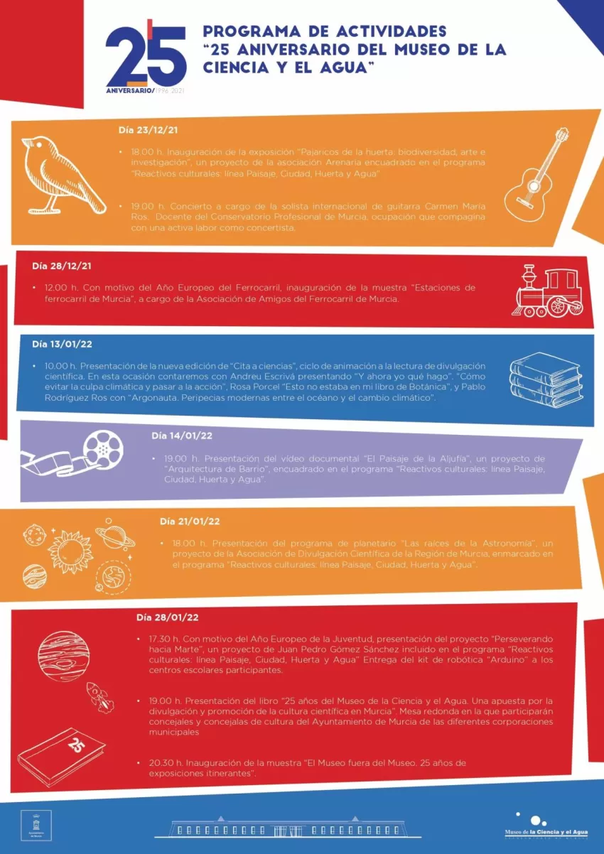 Por último, el día 28 de enero tendrá lugar la presentación del libro '25 años del Museo de la Ciencia y el Agua. Una apuesta por la divulgación y promoción de la cultura científica en Murcia' en una mesa redonda que contará con la participación de concejales y concejalas de Cultura de diferentes corporaciones municipales.
