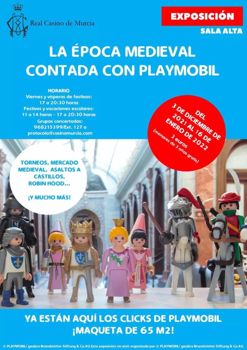 'La época medieval contada con Playmobil' puede visitarse los viernes y vísperas de festivos de 17.00 a 20.30 horas y los festivos y vacaciones escolares de 11.00 a 14.00 horas y de 17.00 a 20.30 horas. Las entradas pueden adquirirse en la recepción del Real Casino de Murcia, por el precio de 3 euros, siendo gratis para los menores de tres años.