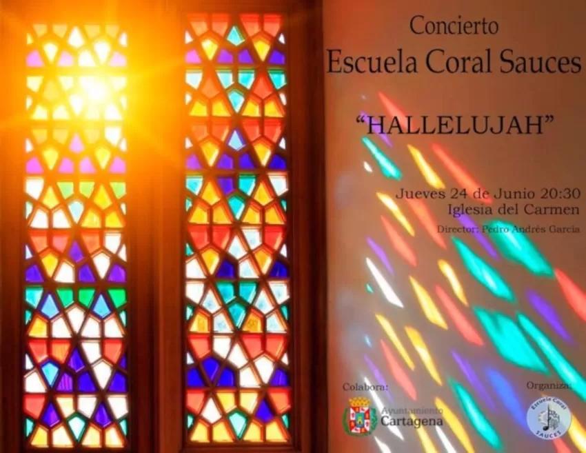 La Escuela Coral Sauces ofrece este jueves un concierto que girará en torno a la palabra hebrea 'Hallelujah' (Aleluya). La audición, organizada por el Ayuntamiento de Cartagena junto a la coral, tendrá lugar a las 20.30 horas, en la iglesia del Carmen.