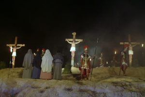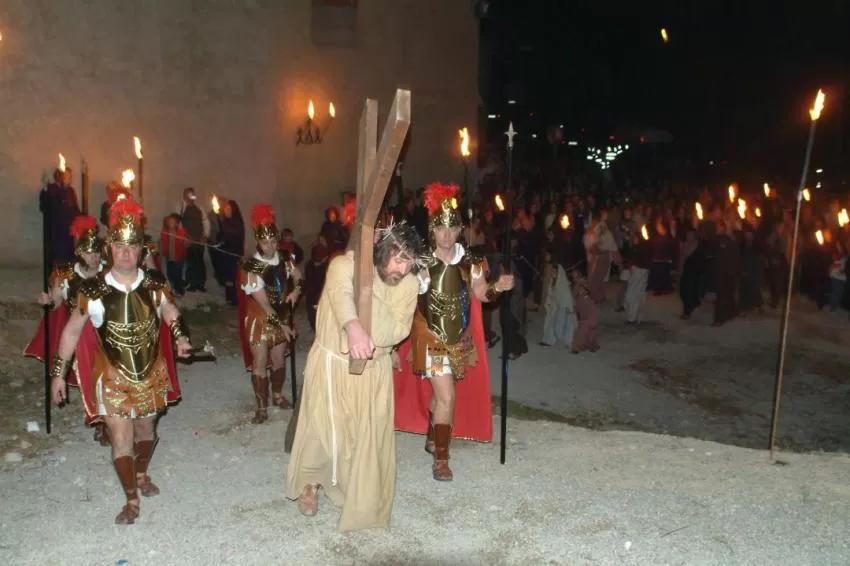 A la luz de la antorchas y con traje de época, más de 100 personas, vecinos de la pedanía, rememoran la Pasión, Muerte y Resurrección de Cristo. Desde el Pretorio, situado en la puerta de la Iglesia, hasta el Gólgota, monte situado a las afueras del pueblo, se escenifican los últimos momentos de la vida de Cristo.