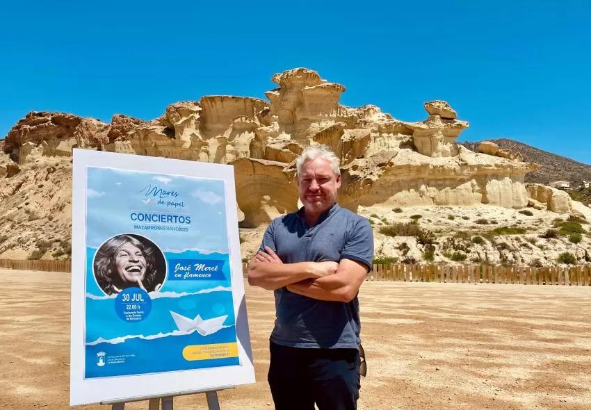 El teniente de alcalde de Cultura, Ginés Campillo, ha desvelado el que será el concierto central del verano en Mazarrón, la actuación de José Mercé. El cantaor jerezano, estrella nacional del arte jondo, llenará de duende la noche mazarronera del viernes 30 de julio en un escenario con embrujo propio, las Erosiones de Bolnuevo.