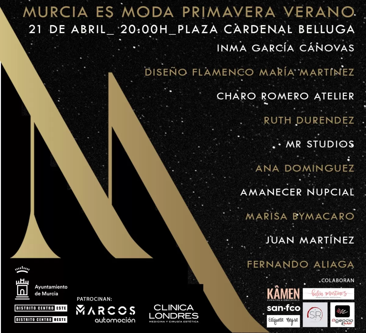 En la pasarela desfilarán los diseños de diez diseñadores y diseñadoras de moda murcianos, como Inma García Cánovas, Diseño Flamenco María Martínez, Charo Romero Atelier, Ruth Durendez, MR Studios, Ana Dominguez, Amanecer Nupcial, Marisa Bymacaro, Juan Martínez y Fernando Aliaga.