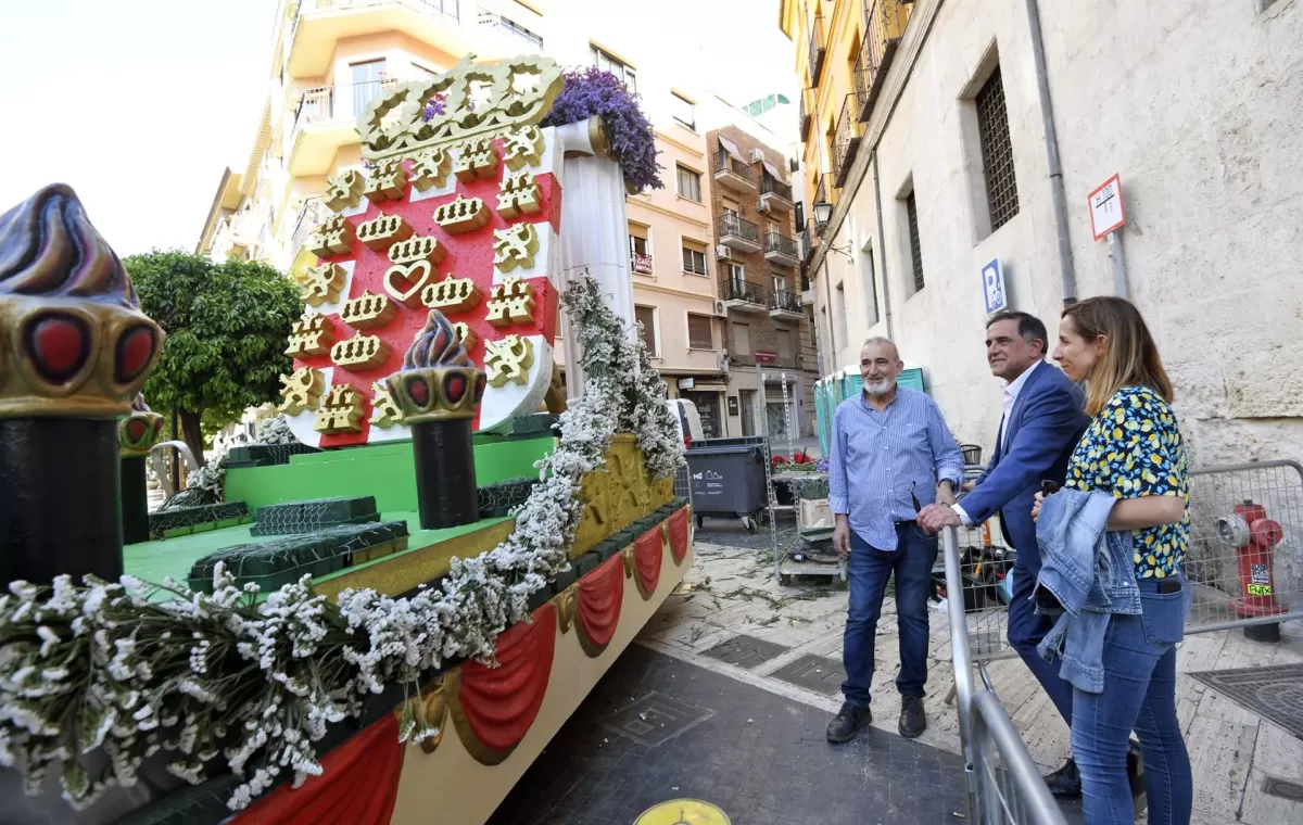 El alcalde de Murcia, José Antonio Serrano, acompañado de la concejala Esther Nevado, ha visitado este miércoles las distintas carrozas que se están engalanando con flores naturales para el desfile del jueves.