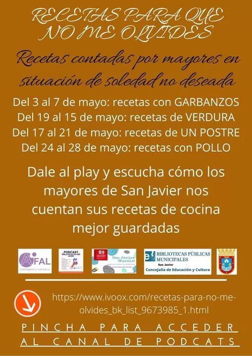 'Recetas para que no me olvides' es el título del proyecto que han puesto en marcha la biblioteca municipal de San Javier y la Asociación de Familiares Enfermos de Alzheimer (AFAL) para animar a las personas mayores a grabar con su propia voz sus recetas de cocina más especiales.