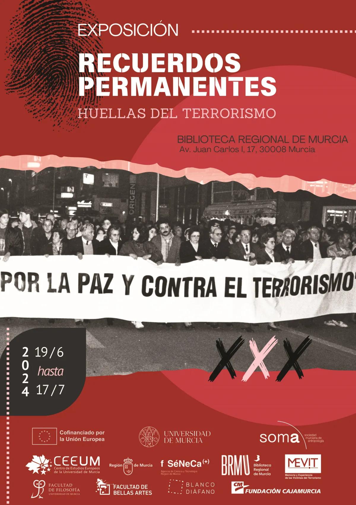 La Biblioteca Regional de Murcia (BRMU), dependiente de la Consejería de Turismo, Cultura, Juventud y Deportes, acoge la exposición ‘Recuerdos permanentes. Huellas del terrorismo’, que se inaugura hoy miércoles, 19 de junio, a las 19:00 horas, y será visitable hasta el 17 de julio.