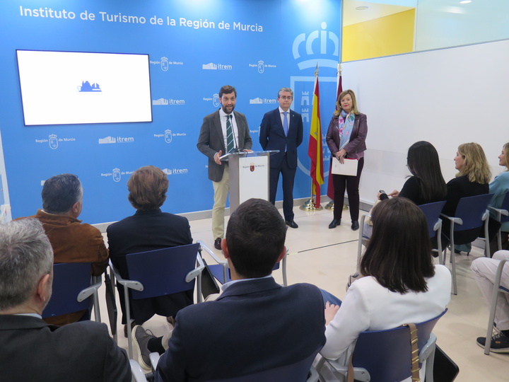 El director del Instituto de Turismo de la Región de Murcia (Itrem), Juan Francisco Martínez, acompañado por la presidenta de la Oficina de Congresos de Murcia, Carmen Antón, y representantes del Ayuntamiento, presentó hoy la nueva estrategia de promoción de la ciudad en el segmento MICE (reuniones, incentivos, congresos y eventos).