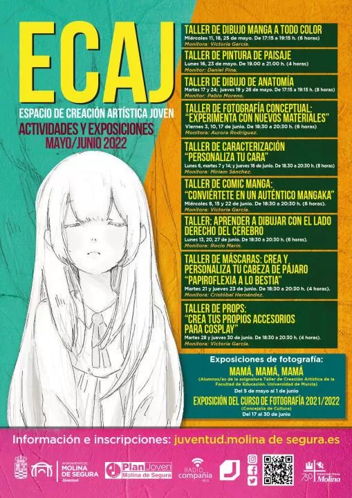 La Concejalía de Juventud del Ayuntamiento de Molina de Segura pone en marcha la nueva programación de actividades del Espacio de Creación Artística Joven (ECAJ) para los meses de mayo y junio. Con esta programación se pone a disposición de los/as jóvenes una variedad de actividades enmarcadas en las distintas modalidades artísticas.