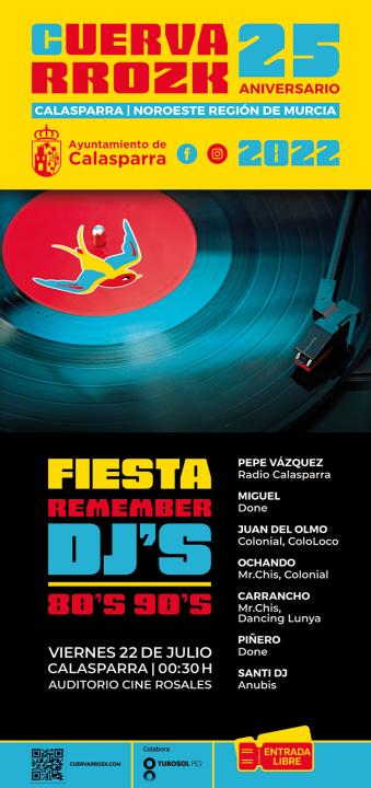 Como cierre a la segunda noche musical de celebración del 25 aniversario del Cuervarrozk (viernes 22 de julio | 00.30 h | Auditorio Cine Rosales ) FIESTA REMEMBER DJ´S 80´S 90´S Sesión que contará con la presencia de una representación de los Djs que en estas dos décadas ambientaban las sesiones nocturnas de los locales en Calasparra.