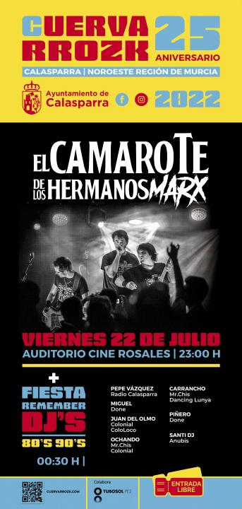 EL CAMAROTE DE LOS HERMANOS MARX en concierto con un contundente y divertido directo y un repertorio-homenaje al Pop Rock de los 80s, 90s ( Viernes 22 de julio | 23.00 h | Auditorio Cine Rosales ).