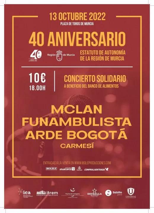Más de 4.500 entradas se han vendido hasta el momento para asistir al concierto que ofrecerán M-Clan, Funambulista, Arde Bogotá y Carmesí el próximo jueves, día 13, en la Plaza de Toros de Murcia, dentro de los actos programados por el Gobierno regional para conmemorar los 40 años del Estatuto de Autonomía.
