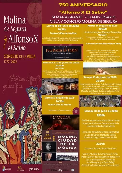 El 13 de junio de 2022 se cumplen 750 años de la constitución de Molina de Segura como Concejo y Villa por el rey Alfonso X El Sabio. Dicha constitución tuvo lugar en 1272 y en ella reside el origen de Molina de Segura, una sociedad dinámica y con personalidad propia cuya identidad se ha ido construyendo a lo largo de los siglos hasta nuestros días. El acto institucional por el que se conmemora el 750 Aniversario de la constitución del Concejo y Villa de Molina de Segura se celebra el lunes 13 de junio, a las 20.30 horas, en el Teatro Villa de Molina (en Avenida del Chorrico, nº 10). Preside el acto el alcalde de la localidad, Eliseo García Cantó.