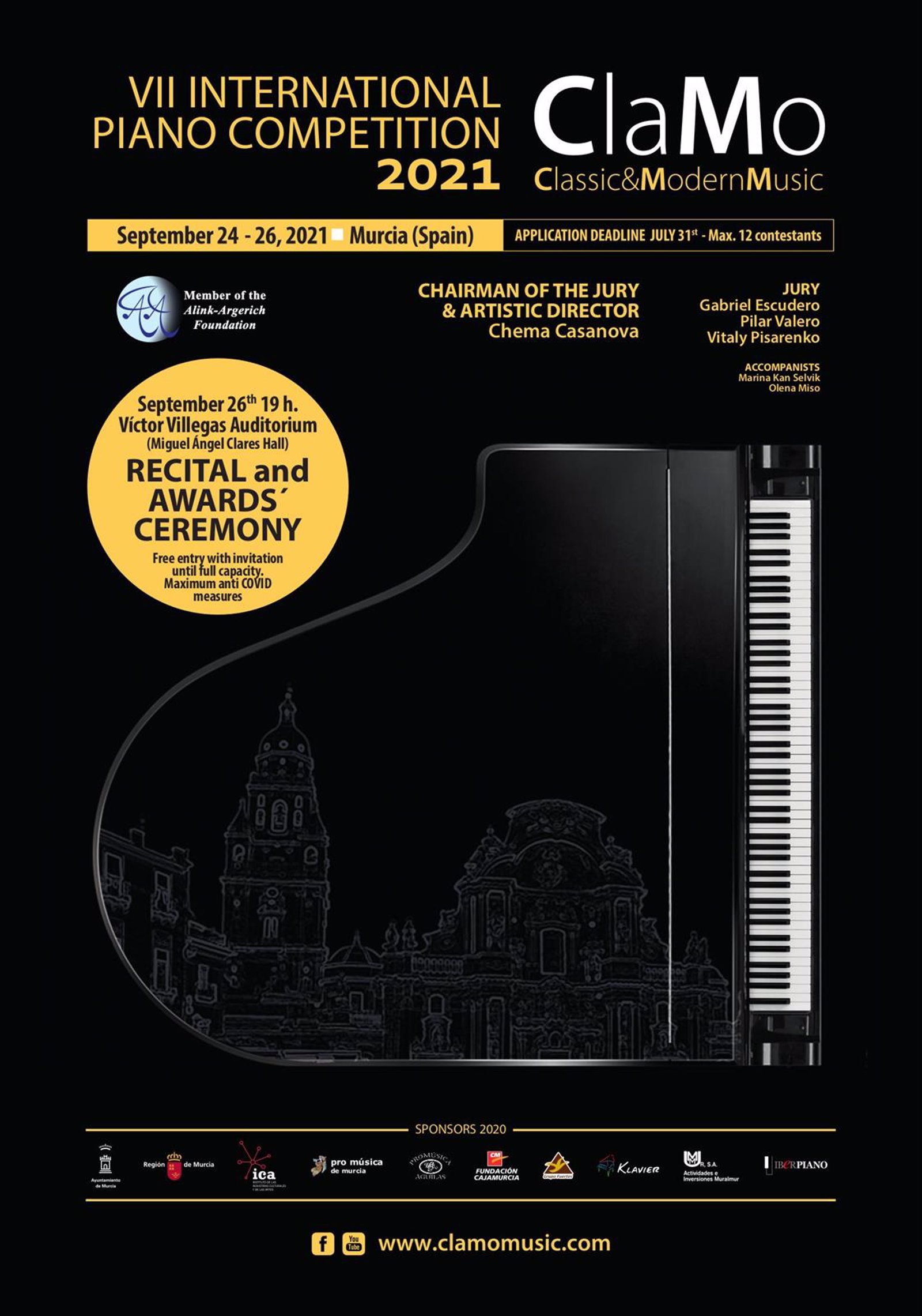 Murcia acogerá en septiembre el VII Concurso Internacional de Piano 'ClamoMusic' así como la actividad paralela 'Pianos en la calle'. Este certamen se ha convertido en un referente en España con cada vez mayor proyección internacional gracias en parte al alto nivel de sus candidatos y miembros del jurado.
