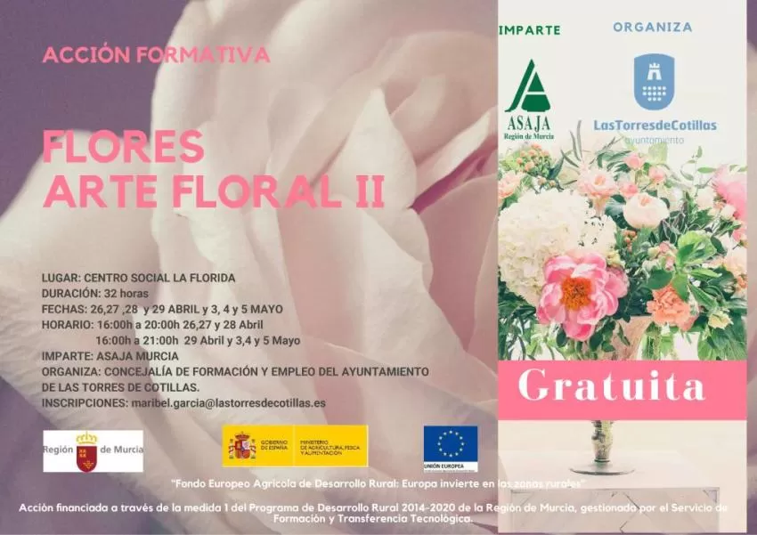 El centro social de La Florida de Las Torres de Cotillas acogerá la segunda edición del curso gratuito de arte floral organizado por la Concejalía de Formación y Empleo. Esta formación se destina preferentemente a personas con interés en la decoración con flores y arte floral y a las interesadas en esta actividad relacionadas con los sectores agrario, alimentario o forestal.