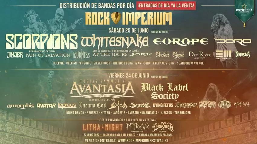 El viernes, 24 de junio, Rock Imperium Festival acogerá las actuaciones de: Avantasia, Black Label Society, Amorphis, Avatar, Leprous, Lacuna Coil, Sodom, Saurom, Dying Fetus, Rhapsody Of Fire, Belphegor, The Vintage Caravan, Midnight , Night Demon, Neonfly, Hitten Lándevir, Aversio Humanitatis, Injector y Turborider. Las entradas individuales para este día cuestan 85 euros más gastos de distribución.