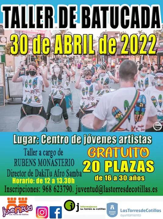 La Concejalía de Juventud de Las Torres de Cotillas ha organizado para el próximo 30 de abril (12:00 horas) un taller de batucada para jóvenes de 16 a 30 años. Tendrá lugar en el Centro de Jóvenes Artistas con una duración aproximada de hora y media, será impartido por Rubens Monasterio -director de DakiTu Afro Samba- y contará con asistencia gratuita.