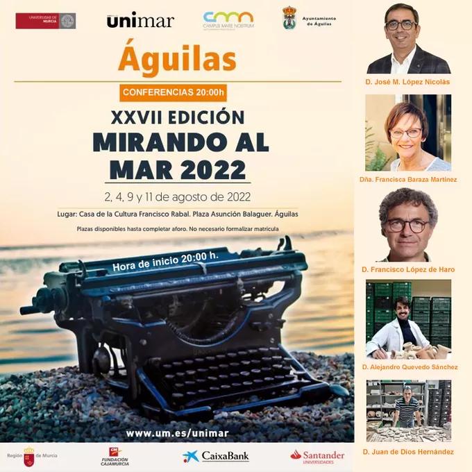 La Universidad Internacional del Mar (Unimar) inicia esta semana la XXVII edición del ciclo de conferencias 'Mirando al Mar', ya un clásico de los cursos de verano de la Universidad de Murcia. En esta edición las ponencias, que comienzan este martes, girarán en torno a temas científicos y relacionados con la naturaleza.