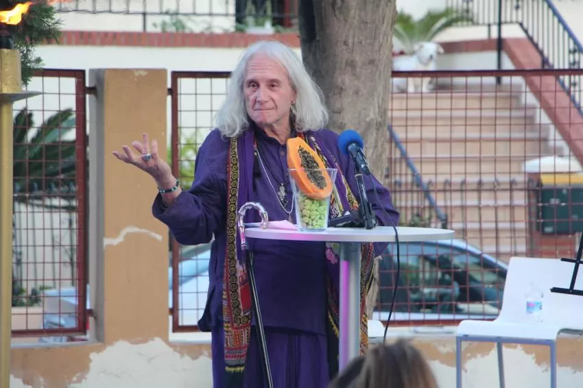 La tarde comenzó con los versos de Safo y otros autores clásicos declamados con sumo gusto por Leonor Benítez, directora del Grupo de Teatro de San Javier desde su fundación en 1989 seguida por los poemas de Soren Peñalver, bohemio, singular y entrañable.