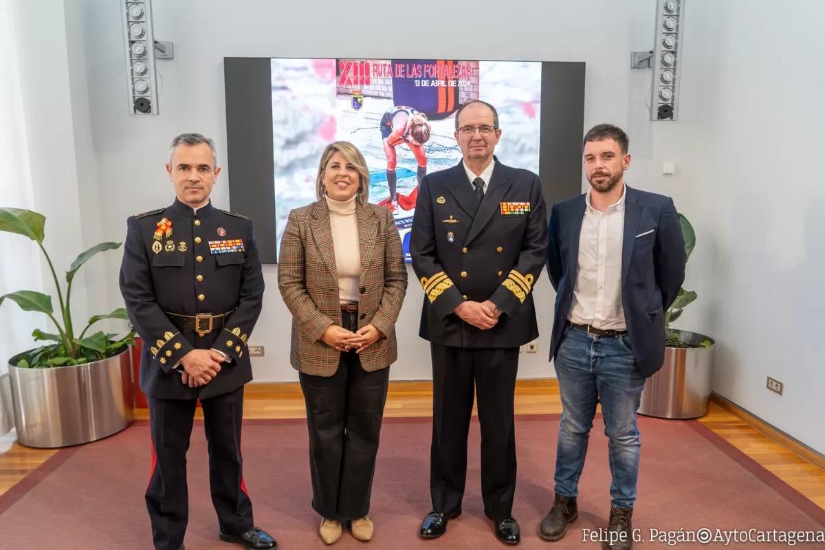 La alcaldesa de Cartagena, Noelia Arroyo, el Almirante Jefe del Arsenal de Cartagena, Pedro Luis de la Puente, y el coronel director de la Escuela de Infantería de Marina "General Albacete y Fuster" y de la prueba, Adolfo Morales, han presentado hoy la nueva edición de la Ruta de las Fortalezas, considerada una de las pruebas de ultratrail más importantes de España. El acto ha contado también con la presencia del concejal de Deportes, José Martínez, y los ediles de la corporación Jesús Giménez, Ricardo Segado y Mercedes Graña.