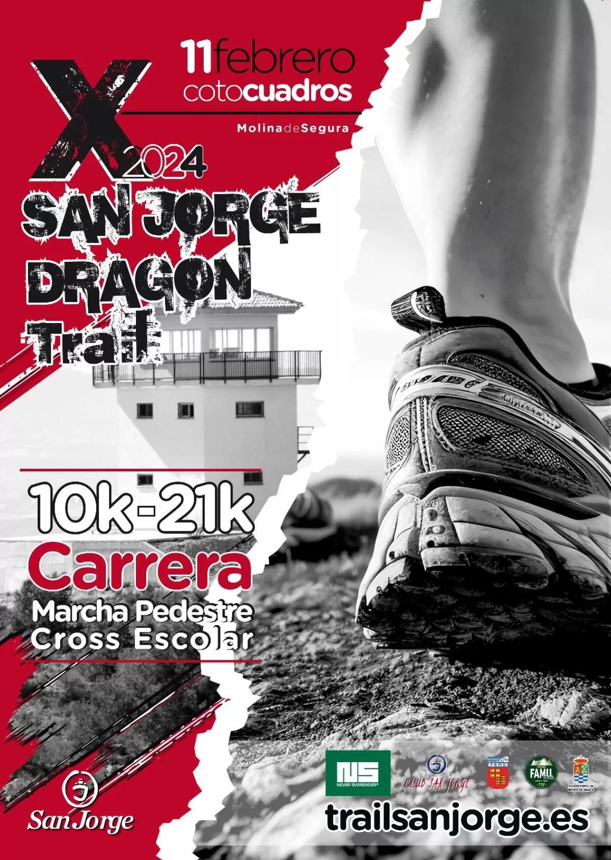 El X San Jorge Dragon Trail 2024, organizada por el Colegio San Jorge y el Club San Jorge, con la colaboración de la Federación de Atletismo de la Región de Murcia (FAMU), y el Ayuntamiento de Molina de Segura, se celebrará en la mañana del domingo 11 de febrero, desde las 09.00 horas, con salida y meta en el Colegio San Jorge, en urbanización La Alcayna, con una carrera para adultos de 21 y 10 kilómetros, una marcha senderista, no competitiva, también de 10 y 21 kilómetros, y kid Cross Escolar para que niños y niñas de 2 a 16 años también puedan participar.