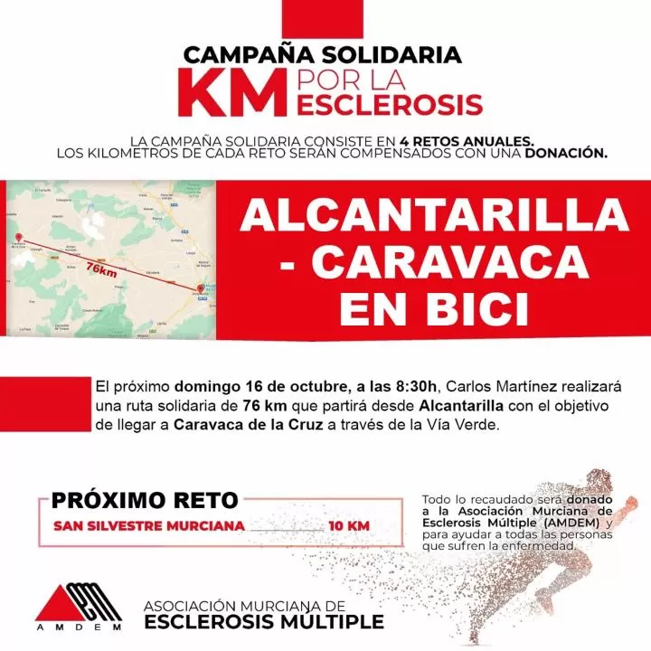 Es por ello que ha preparado una serie de retos deportivos, con los que colaborará con la Asociación Murciana de Esclerosis Múltiple (AMDEM) para la financiación de los servicios que ofrece dicha asociación. El primero de estos retos, enmarcados bajo la campaña solidaria 'KM por la Esclerosis', se superó con la Carrera Popular en la Base Aérea de Alcantarilla, en la que Carlos recorrió los 14 km que la componen.