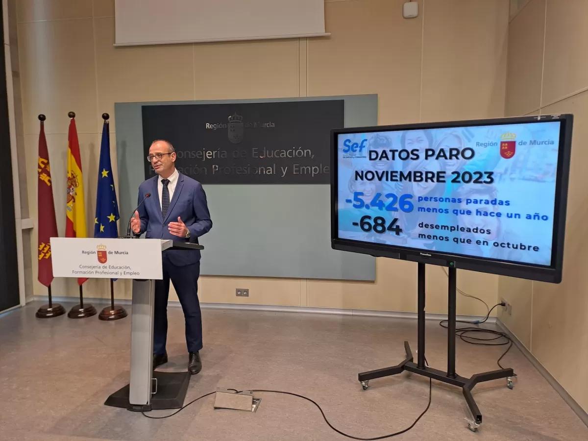 El paro descendió en 684 personas el pasado mes de noviembre, un 0,79 por ciento respecto al mes anterior. La cifra total de personas desempleadas en la Región de Murcia se situó en 85.576, la más baja registrada en un mes de noviembre desde 2007. El pasado noviembre dejó en la Región 5.426 personas desempleadas menos que hace un año, con un 5,96 por ciento de descenso anual.