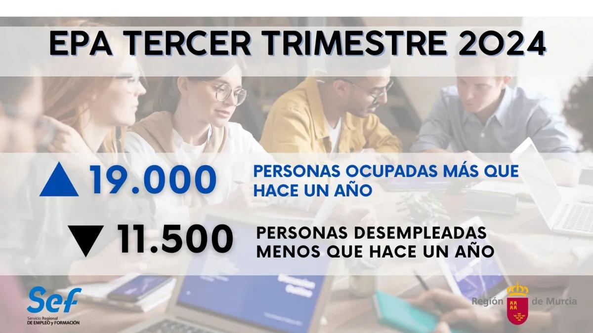 En relación con el trimestre anterior, se produce una disminución del paro de 4.600 personas, un 4,69 por ciento menos. Es el dato más bajo de paro para un tercer trimestre desde el 2007. La tasa de paro disminuyó 0,68 puntos porcentuales este trimestre. En España, se registra una bajada trimestral del paro del 0,04 por ciento, 4,65 puntos menos que la Región de Murcia.