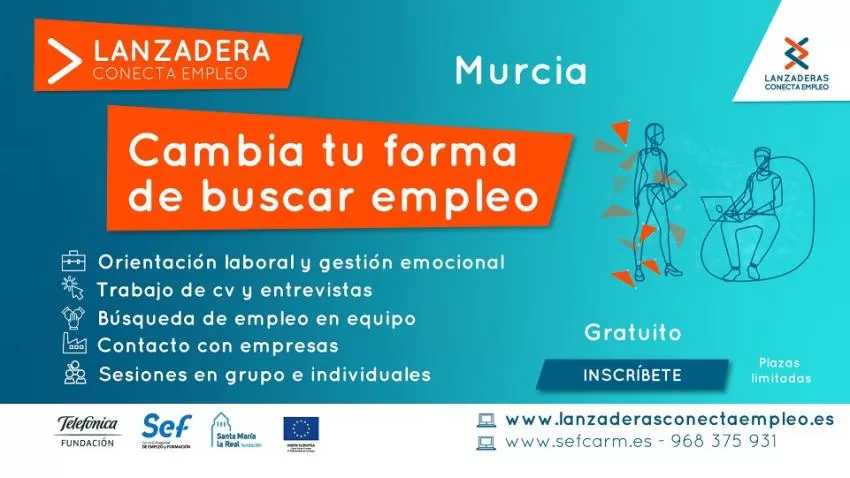 La ciudad de Murcia contará a partir de mediados de junio con una nueva 'Lanzadera Conecta Empleo' en la que ya es posible inscribirse. Se trata del programa gratuito de orientación laboral, impulsado por la Fundación Santa María la Real y la Fundación Telefónica con la colaboración del Servicio Regional de Empleo y Formación (SEF), para ayudar a personas en desempleo a reactivar su búsqueda de trabajo con nuevas técnicas y herramientas acordes al mercado laboral actual.