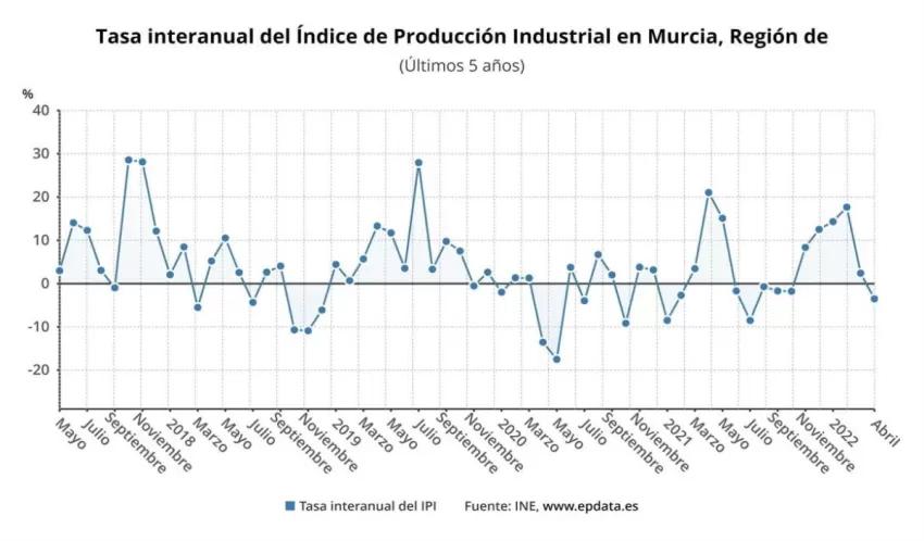El Índice General de Producción Industrial (IPI) disminuyó en la Región de Murcia un 3,5% en abril respecto al mismo mes del año anterior, la cuarta mayor caída por comunidades, frente a la bajada del 0,4% de la media nacional, según ha informado este martes el Instituto Nacional de Estadística (INE).