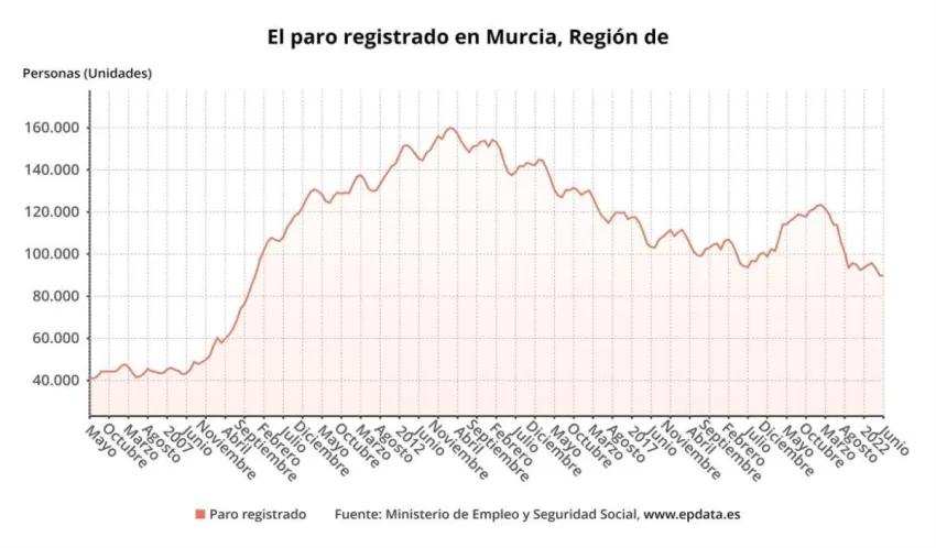El número de desempleados registrados en las oficinas de los servicios públicos de empleo (antiguo Inem) en la Región de Murcia al término del mes de junio se situó en 89.650, lo que supone un descenso de 319 personas respecto a mayo, según datos difundidos este lunes por el Ministerio de Trabajo y Economía Social.