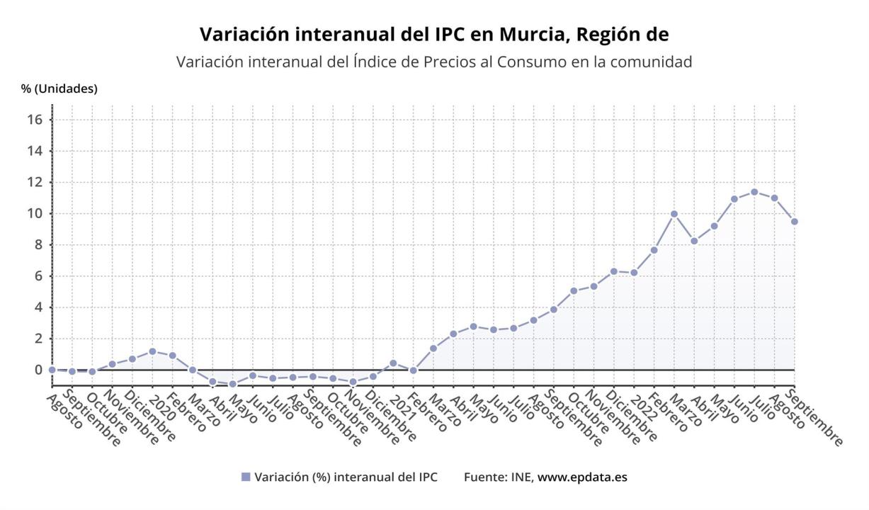 El Índice de Precios de Consumo (IPC) de la Región de Murcia bajó un 0,7% en septiembre con respecto al mes anterior, el undécimo mayor descenso de todas las comunidades autónomas junto con Aragón, mientras que en términos internuales aumentó un 9,5%, según datos difundidos este viernes por el Instituto Nacional de Estadística (INE) y recogidos por Europa Press.