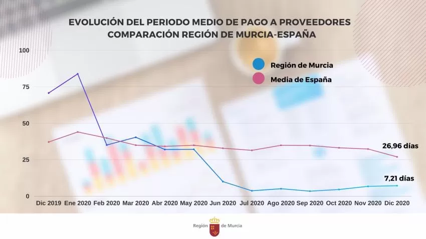 En concreto, el periodo medio de pago a proveedores de los últimos siete meses en la Región de Murcia fue de 10,05 días en junio; 3,73 días en julio; 5,14 días en agosto; 3,49 días en septiembre; 4,63 días en octubre; 6,76 días en noviembre, y 7,21 días en diciembre. Todos los datos han sido los mejores del país en cada uno de los meses.