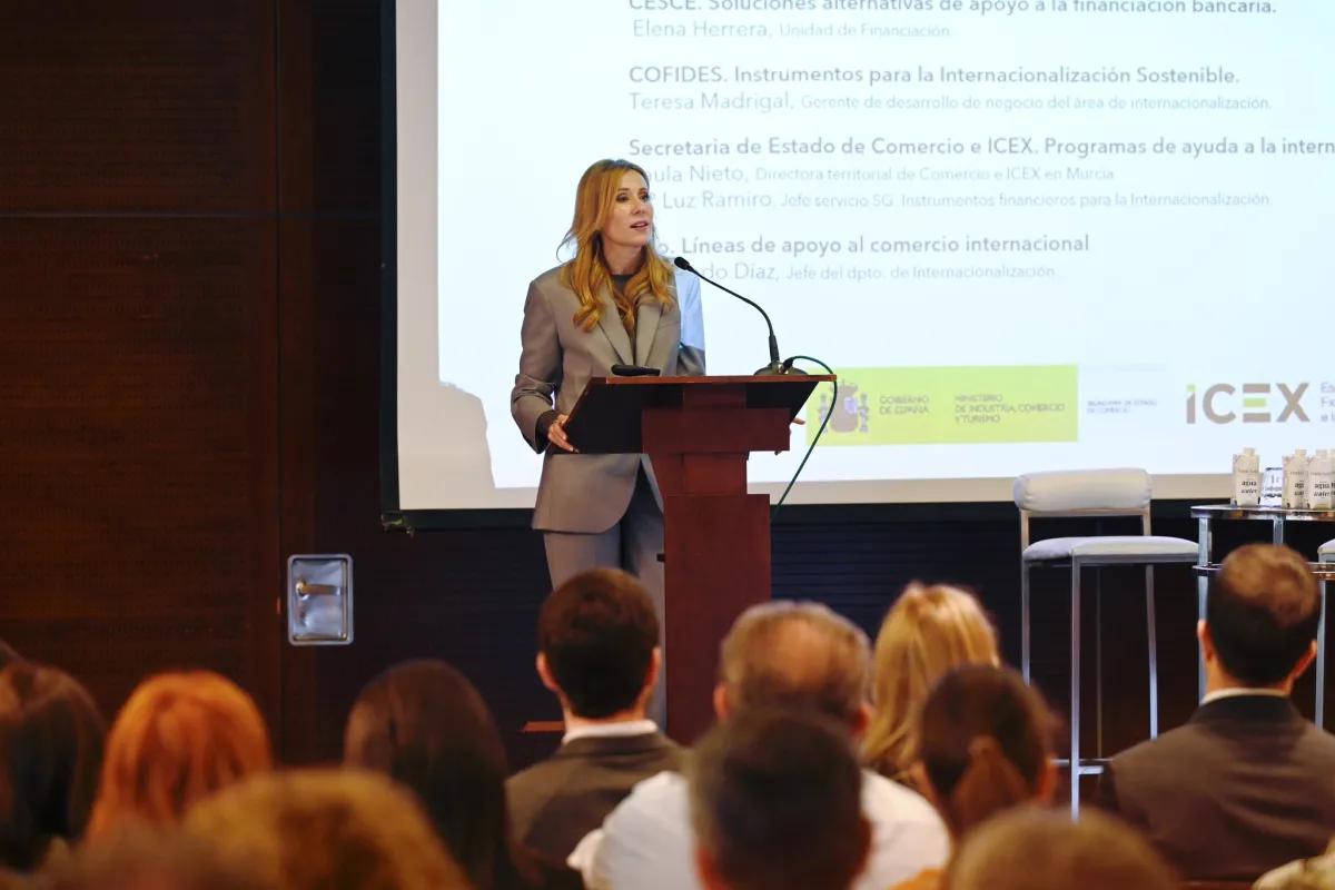 Así lo puso de manifiesto esta mañana la consejera de Empresa, Empleo y Economía Social, Marisa López Aragón, durante la inauguración de una jornada sobre ‘Financiación de la internacionalización empresarial’, organizada por el Instituto de Fomento (Info), junto con la Delegación Territorial de Comercio e ICEX en Murcia, donde, entre otras cuestiones, se dieron a conocer las diferentes líneas de ayudas para el apoyo a las empresas en su expansión hacia mercados internacionales.