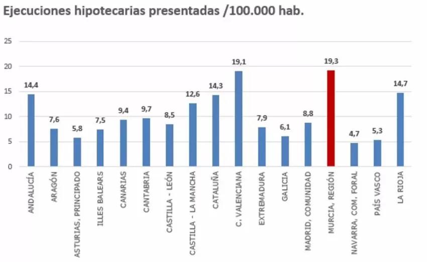 Si de nuevo se atiende al número de ejecuciones hipotecarias ingresadas en relación con la población, la Región de Murcia, con 19,3 registradas por cada 100.000 habitantes, se sitúa en la comunidad con más ejecuciones hipotecarías del país, en términos relativos, seguida por la Comunidad Valenciana, con 19,1; y La Rioja, con 14,7.