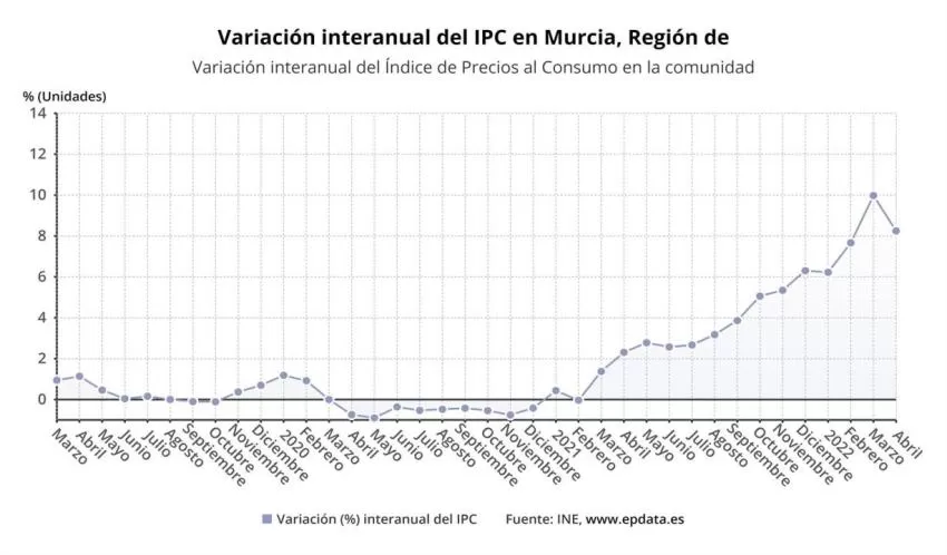 Así, la tasa interanual del IPC en la Región de Murcia se sitúa por detrás del experimentado en Castilla-La Mancha (11,7%); Castilla-La Mancha (10,4%); Castilla y León (9,6%); Aragón (9,4%); Galicia (9,1%); La Rioja (8,8%); Extremadura y Navarra (8,7%); Cantabria y Melilla (8,5%); Andalucía y Comunidad Valenciana (8,4%) y Asturias (8,3%).