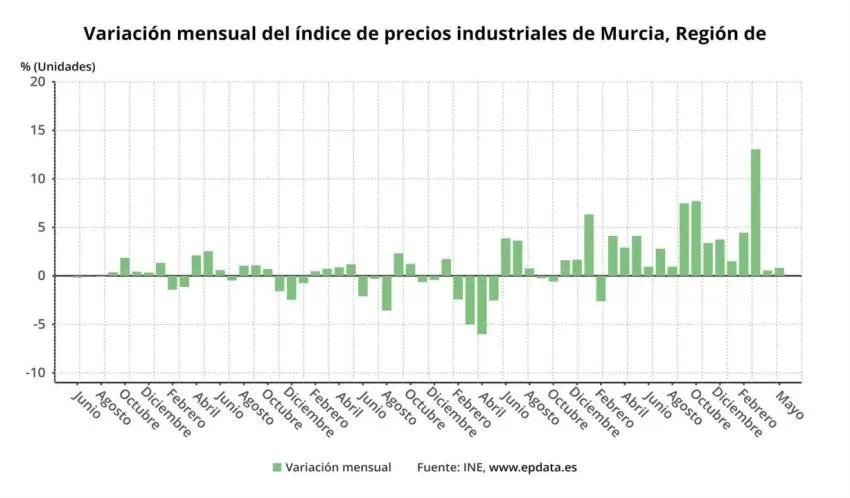 El Índice de Precios Industriales (IPRI) en la Región de Murcia ha aumentado un 58 por ciento en mayo en relación al mismo mes del año anterior, según ha informado este lunes el Instituto Nacional de Estadística (INE).