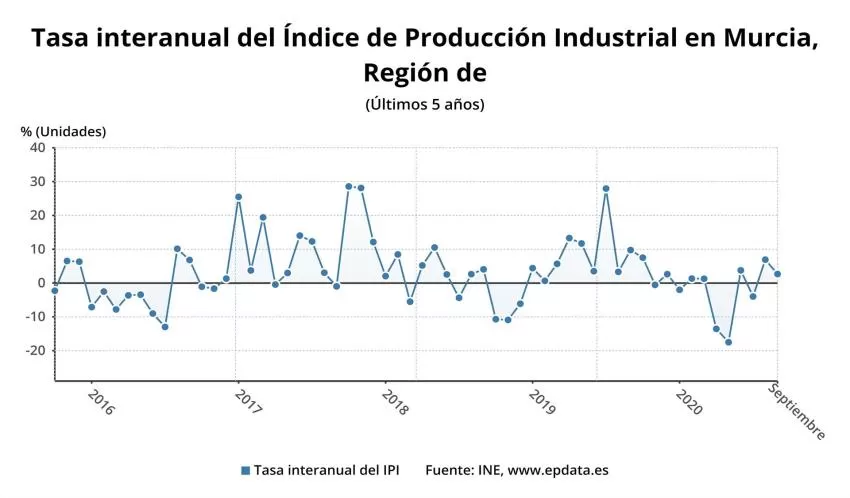 La producción industrial en la Región de Murcia en el mes de septiembre ha aumentado un 2,7% respecto al mismo mes del año anterior, la mayor subida por comunidades autónomas. En el conjunto de España se produjo un descenso del 0,6%, según ha informado este viernes el Instituto Nacional de Estadística (INE).