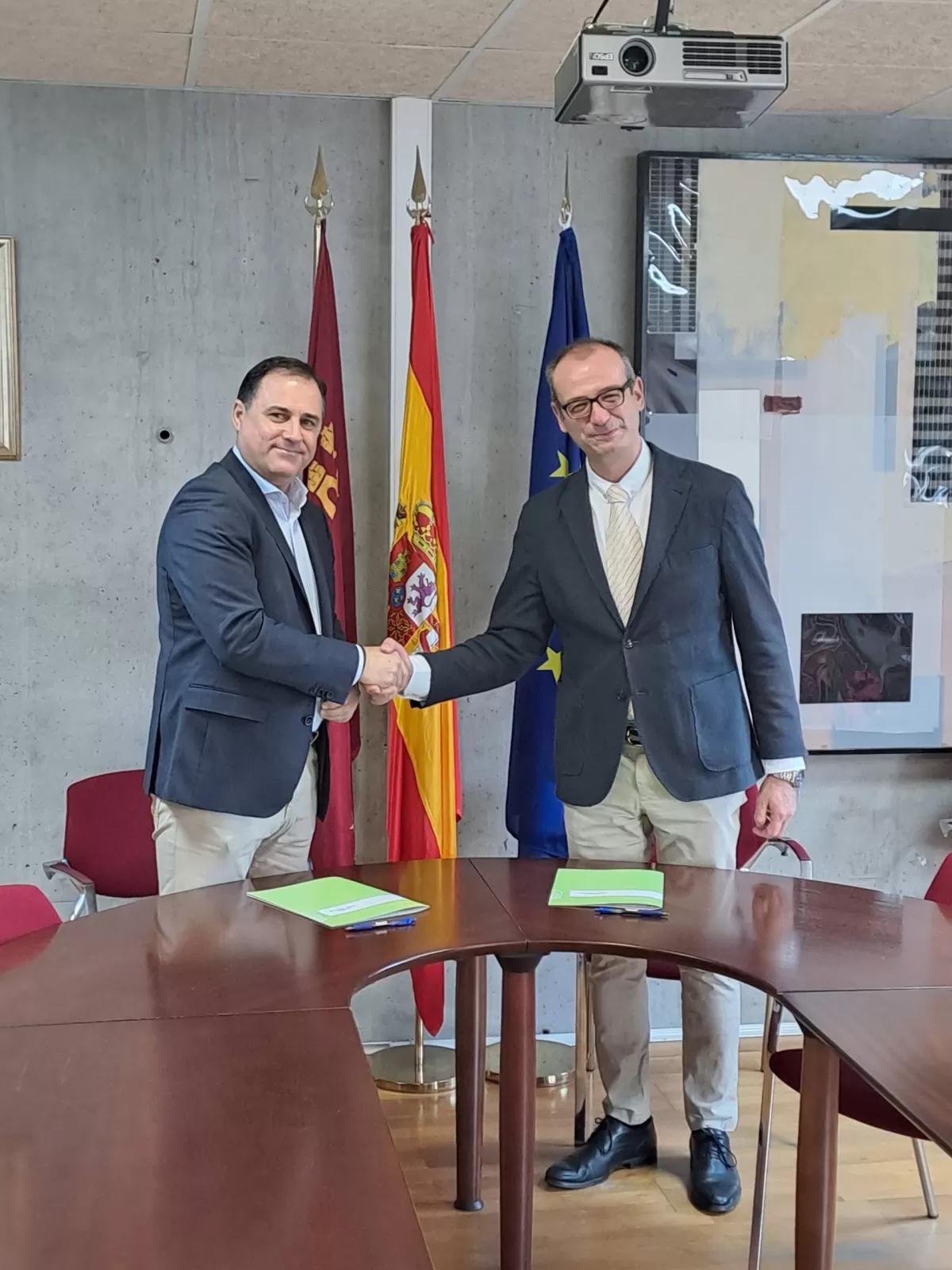 El consejero en funciones de Educación, Formación Profesional y Empleo, Víctor Marín, ha firmado este martes un convenio de colaboración con el presidente de la Federación Regional de Empresarios de la Construcción de Murcia (Frecom), José Hernández, para la promoción de la Formación Profesional Dual entre sus empresas asociadas.