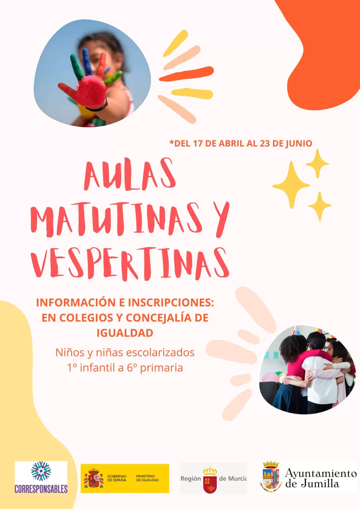 La Concejalía de Igualdad del Ayuntamiento de Jumilla, a través del Programa Corresponsables, al amparo del Acuerdo de la Conferencia Sectorial de Igualdad de 24 de febrero de 2022, ha puesto en marcha de nuevo el Servicio de Aulas de Conciliación, subvencionadas hasta final del curso 2022/23.